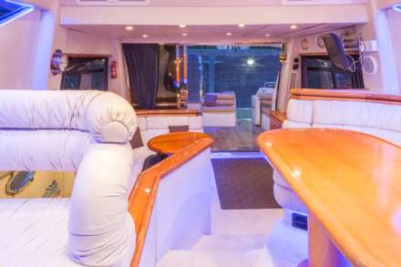 Twin sliding patio doors from cockpit to split level saloon, Portside cabinets with champagne cooler & bar, lower dinette with adjustable table, Steps down to galley, Captains/guest cabin off galley with heads ensuite Upper saloon seating for 8 with twin pedestal table Double helm seating Companionway down to cabins Portside, twin berth with ensuite heads Starboard, twin berth with access to Portside heads